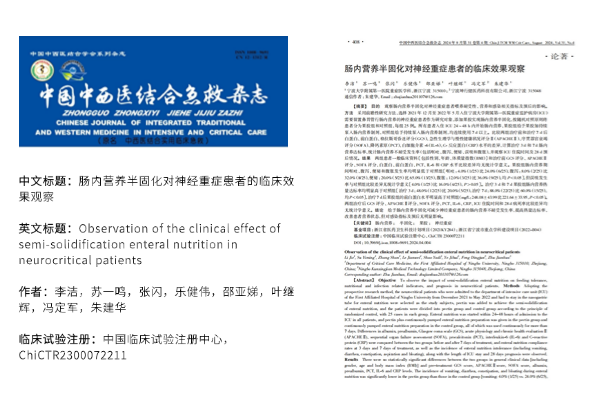 近期,《腸內(nèi)營養(yǎng)半固化對(duì)神經(jīng)重癥患者的臨床效果觀察》在核心期刊《中國中西醫(yī)結(jié)合急救雜志》發(fā)表。