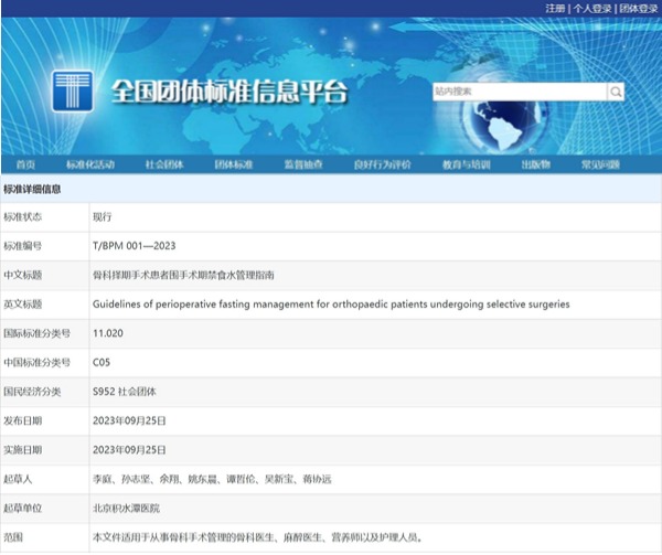 為將ERAS理念在創傷骨科全面深入推廣應用,2023年9月,北京圍手術期醫學研究會批準發布了《骨科擇期手術患者圍手術期禁食水管理指南》(T/BPM 001-2023)團體標準[1]。